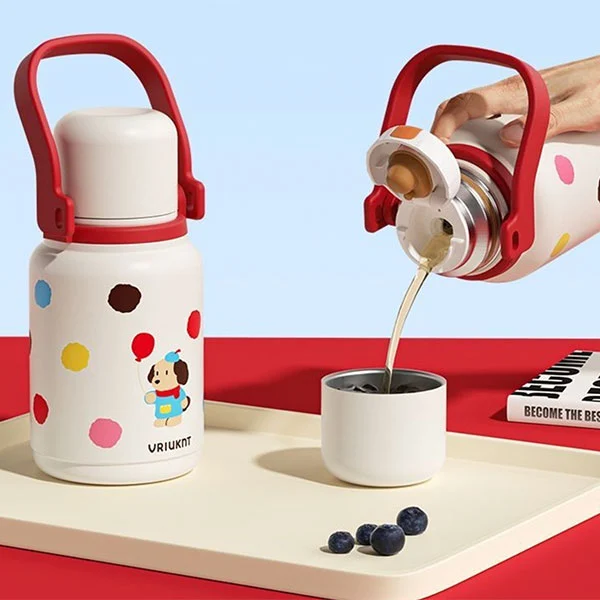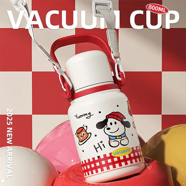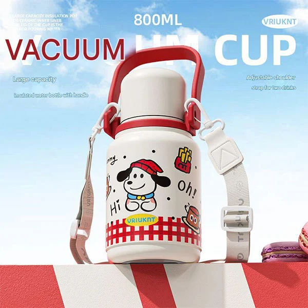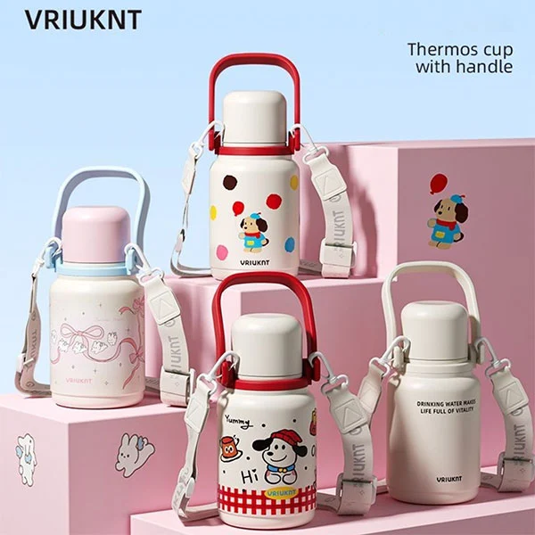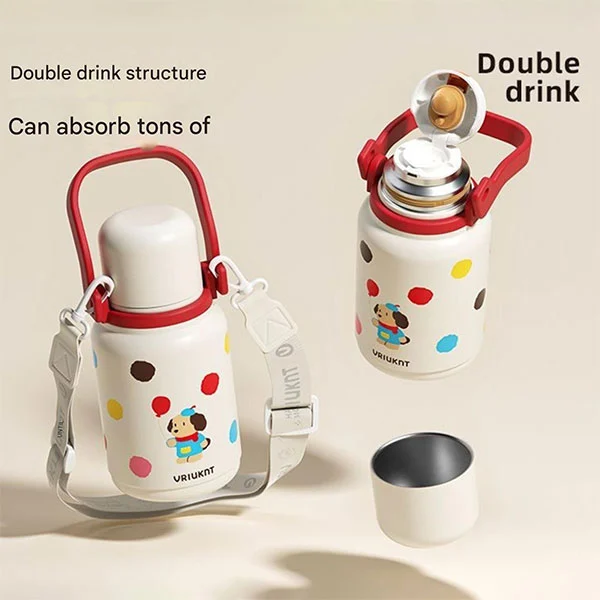 డిష్వాషర్ సేఫ్ వాక్యూమ్ ఫ్లాస్క్ పెద్ద హ్యాండిల్తో వస్తుంది మరియు భుజం పట్టీతో వస్తుంది, పిల్లలు లేదా పెద్దలు తమ చేతులను పైకి లేపడానికి మరియు విడిపించుకోవడానికి అనుకూలంగా ఉంటుంది. మూత నీటి కప్పుగా కూడా ఉపయోగపడుతుంది